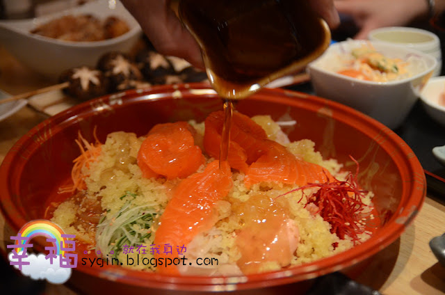 Sashimi to Shake Teriyaki Set我们共点了两套,Jeffry和我share share一套,另对朋友也share一套。但是我们就多点了一碗饭,不打算吃太饱因为今晚还会会夫家拜天公家婆必定准备食物。一套的Sashimi to Shake Teriyaki Set有烤三文鱼、鱼生、味噌汤、蒸蛋、沙拉和水果。我们将白饭换成三文鱼炒饭。